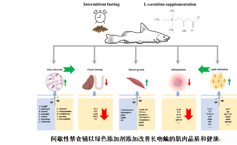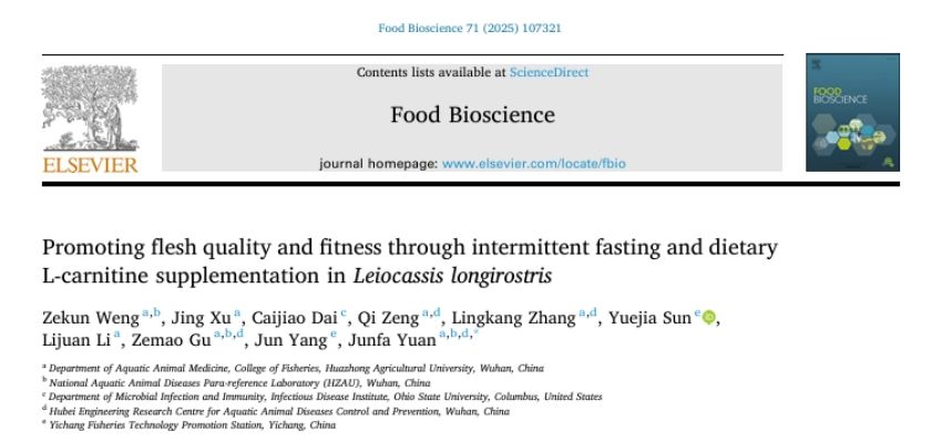 袁军法副教授团队在国际学术期刊Food Bioscience发表了题为“Promoting flesh quality and fitness through intermittent fasting and dietary L-carnitine supplementation in Leiocassis longirostris”的研究论文。该研究综合利用现代生物技术,成功研发长吻鮠环保高效暂养技术。相比传统的“瘦身”(吊水)养殖模式,采用间歇性禁食辅以绿色添加剂添加的方法暂养28天显著提升鱼肉品质和风味,减轻长期饥饿引起的体重损耗和死亡状况,维护鱼体健康。