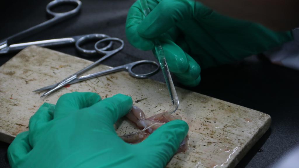 比赛现场,参赛选手们有条不紊地进行实验操作。来自华中农业大学的杨东烨用左手拇指按住青蛙的背部,食指按住青蛙头前部,另一只手持着毁髓针,轻车熟路地找到了青蛙的枕骨大孔。杨东烨说:“找到枕骨大孔后要捣毁脑组织和脊髓组织,破坏完全的青蛙的四肢是松软的。这也是后续实验步骤的基础。”接着她用剪刀剪断蛙的脊柱,剥去皮肤和内脏组织,分离双腿,小心翼翼地用玻璃分针分离坐骨神经。在成功制作标本后,她长松了一口气。她说:“在比赛过程中,心态才是真正的决胜因素。”