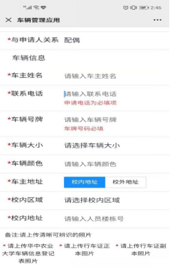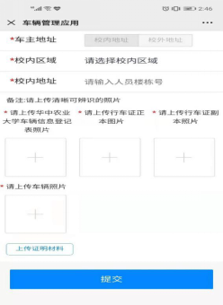 1.必传图片包括“华中农业大学车辆信息登记表”(见附件)“行车证正本”“行车证副本”“车辆照片”,教职工、学生办理车辆上传以上材料即可。