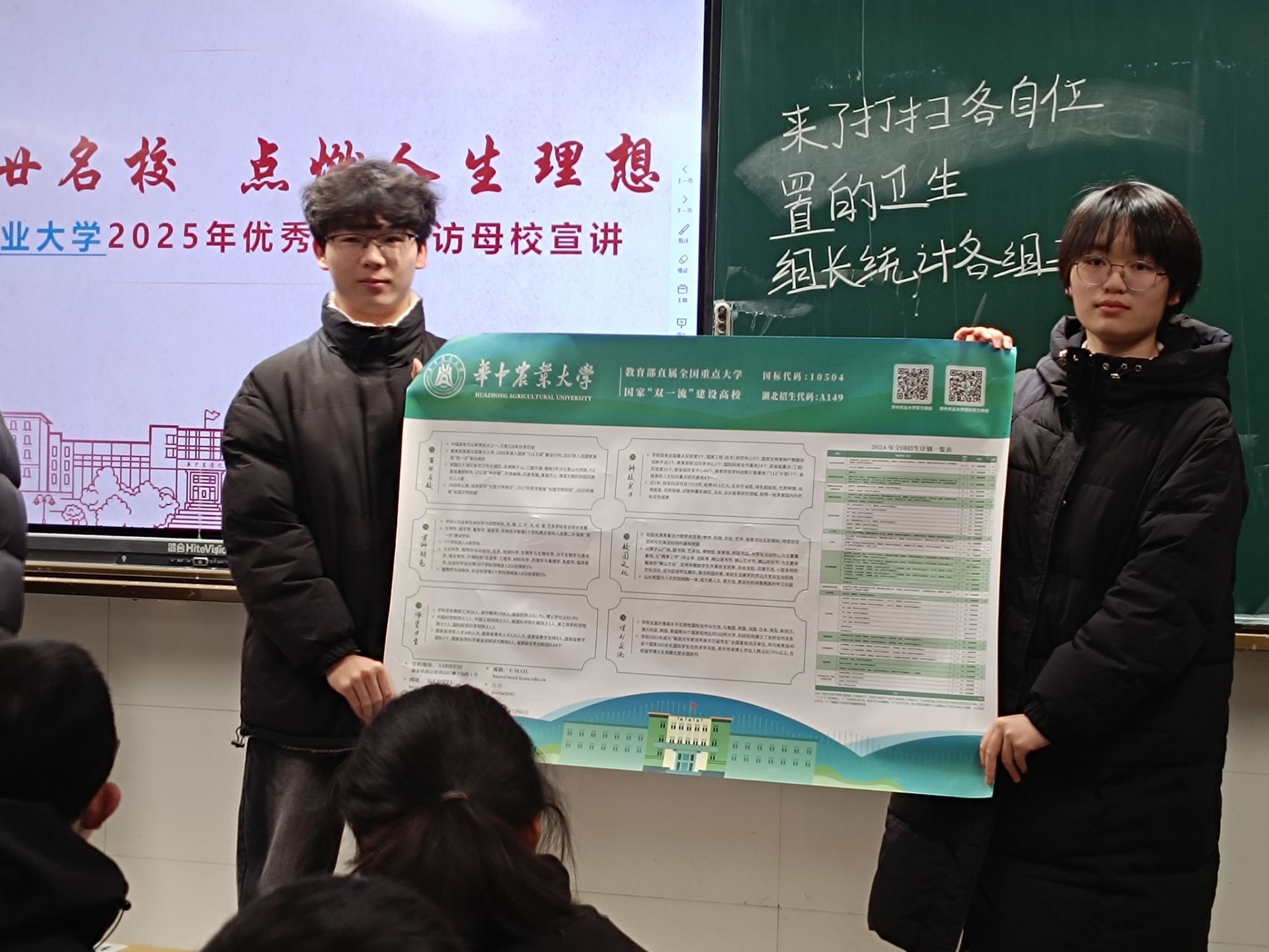 近日,华中农业大学赴湖北省仙桃中学回访实践团,走进湖北省仙桃中学,开展了一场以“遇见狮山,逐梦华农”为主题的招生宣传活动。此次活动旨在深化两校协同育人机制,展现华中农业大学“勤读力耕、立己达人”的育人理念与狮山校园文化的独特魅力。