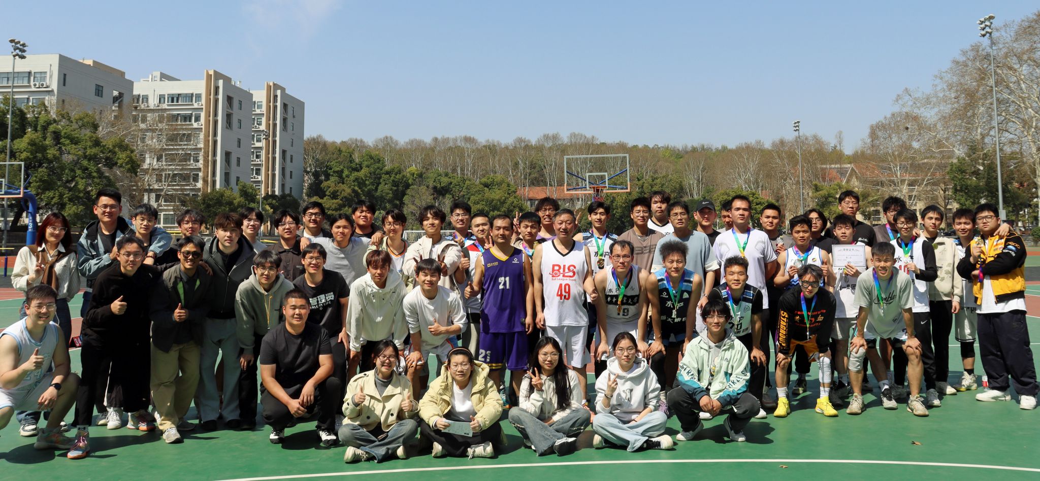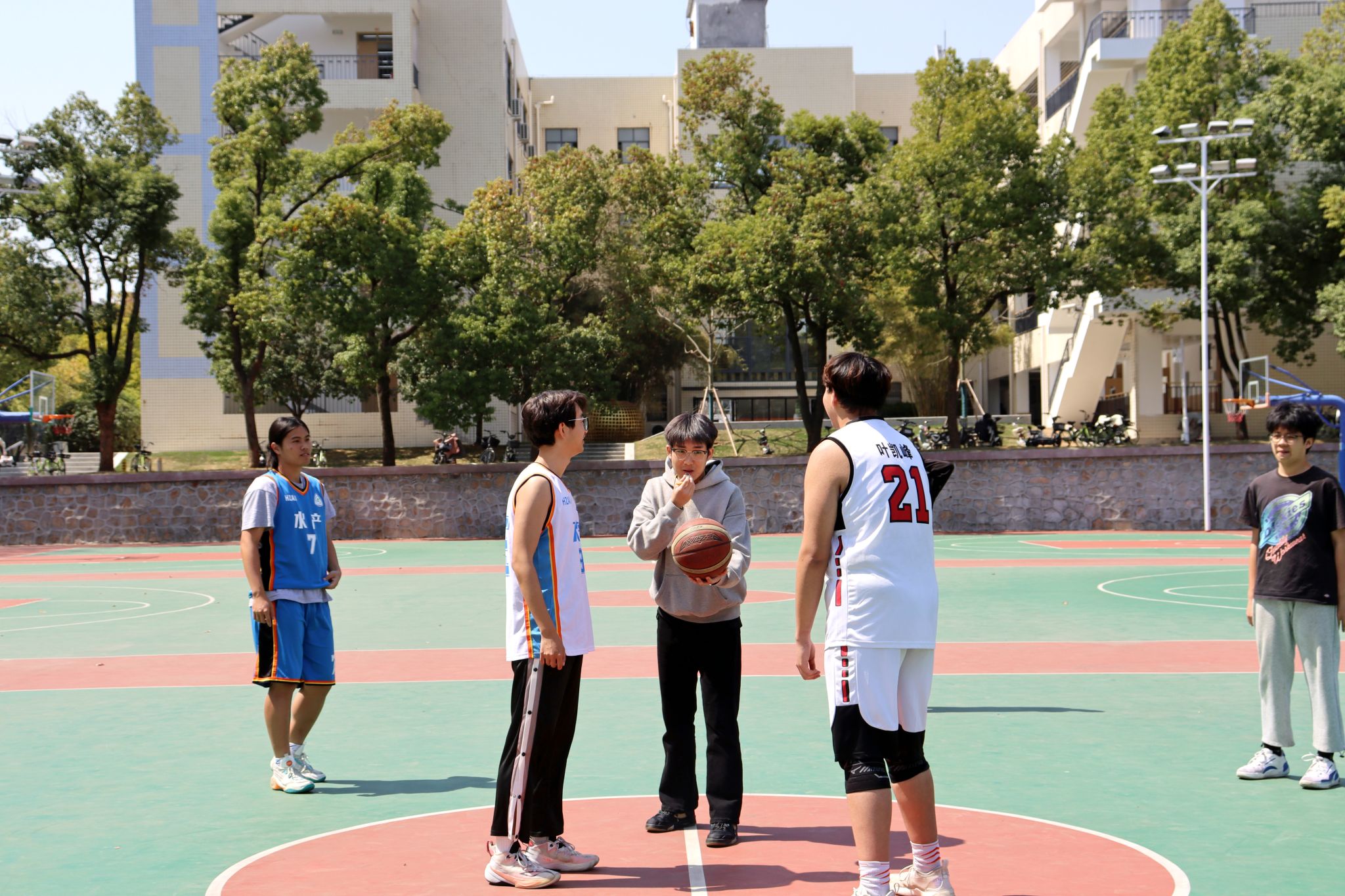 在篮球赛的开场哨声吹响前,教职工联队与新生联队已蓄势待发。教职工们沉稳地做着拉伸、跑跳、投篮等热身动作,丰富的赛场经验使他们动作娴熟、有条不紊;本科生们则活力满满,眼神中透露出对比赛的期待与兴奋,认真地完成每一个热身动作。