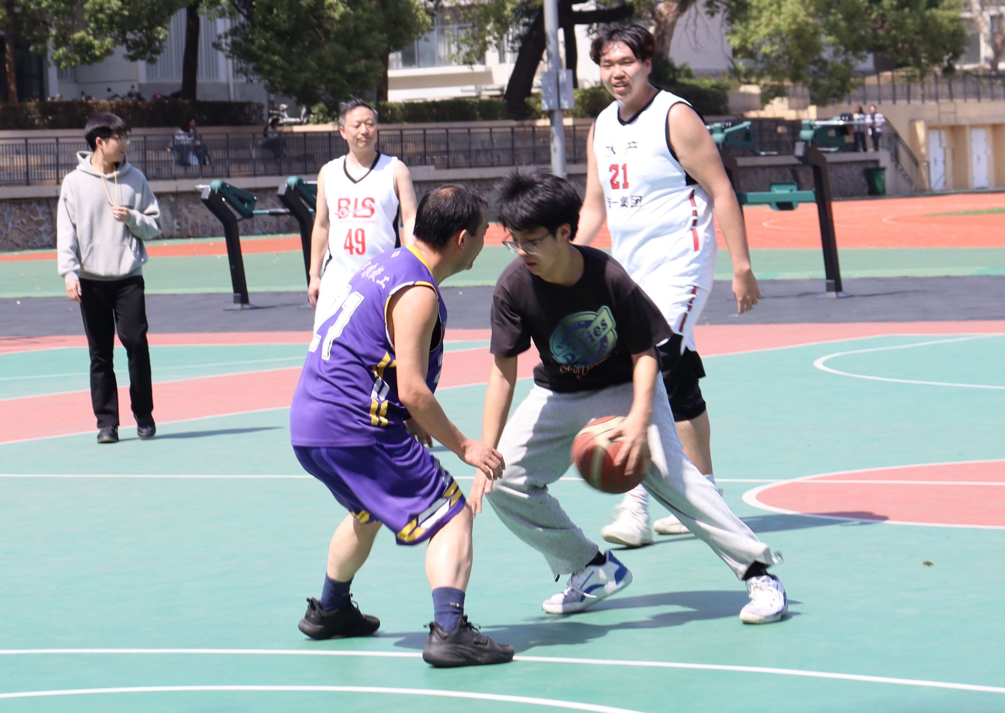 “从游”杯篮球师生交流赛在第一运动场篮球场拉开帷幕,本场比赛由教职工联队对阵本科生联队。