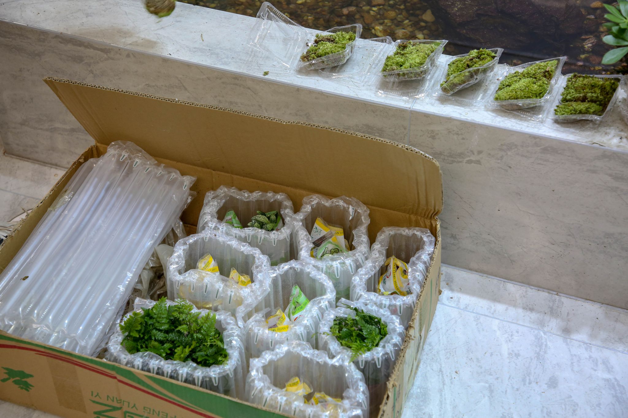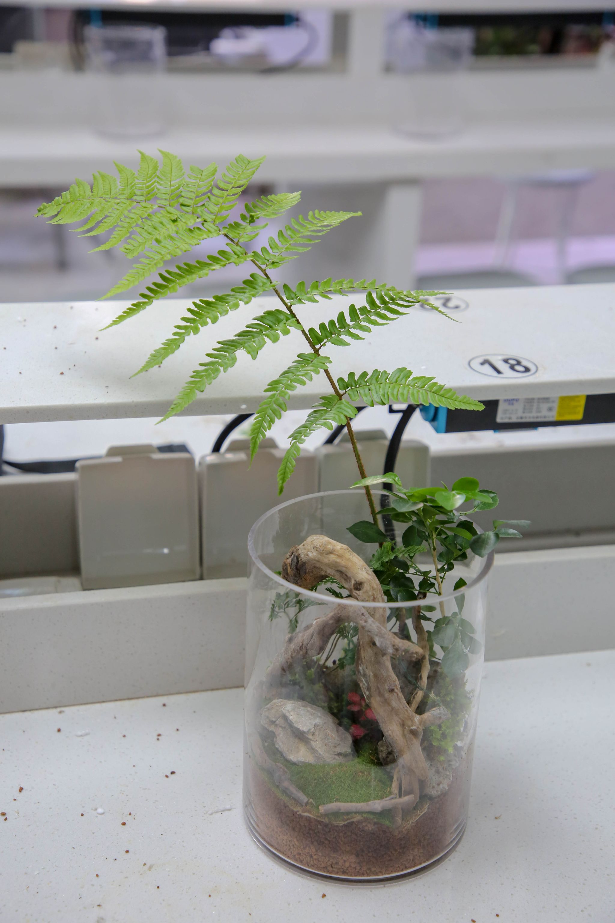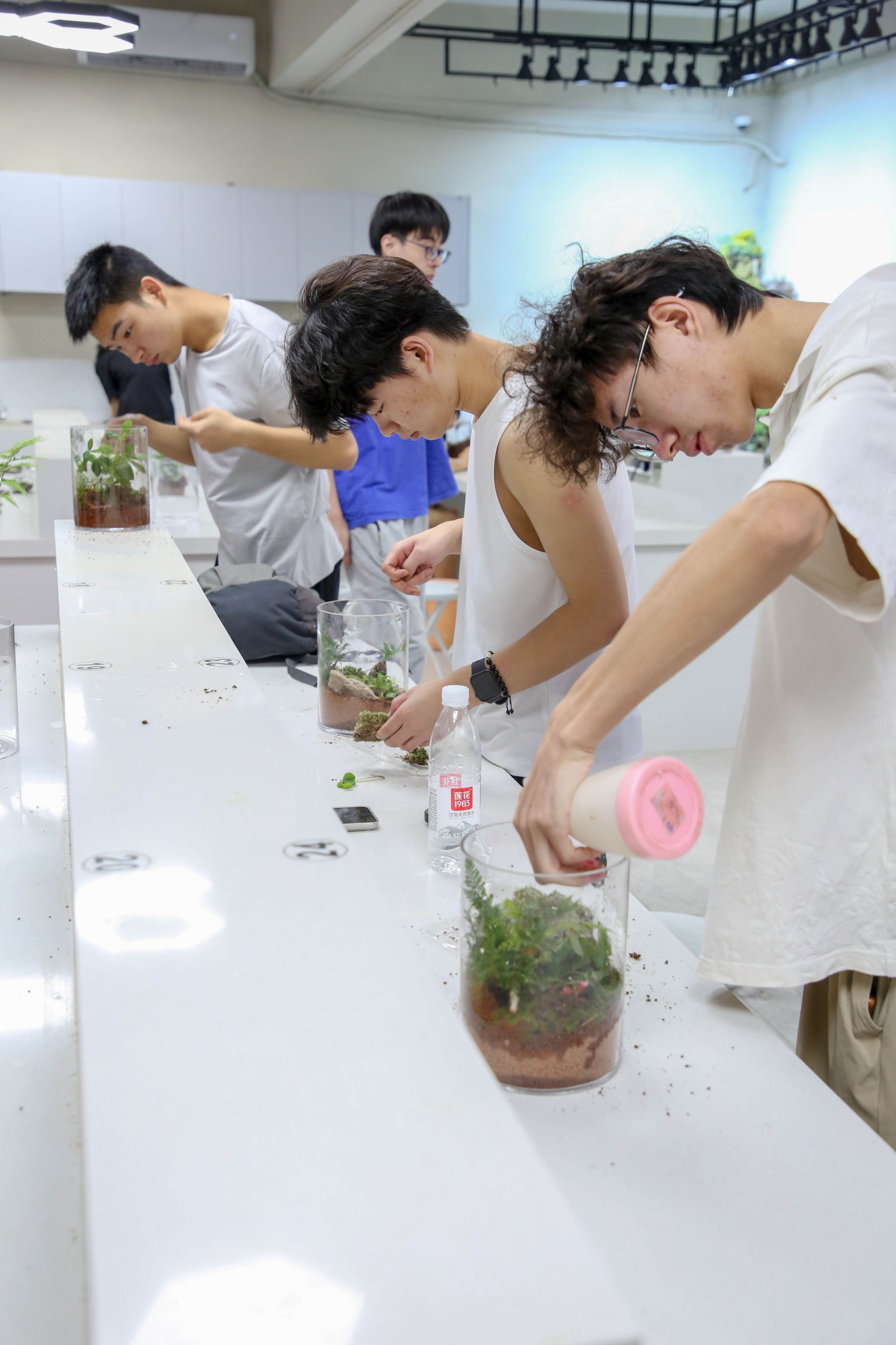 随后,满怀憧憬的参与者们踏上了前往狮子山额野采之路。抵达目的地后,大家迅速投入到采集工作中,小心翼翼地挑选各种苔藓和心仪的植物。采集袋中很快便装满了形态各异、翠绿欲滴的植物素材,收获颇丰。回到水族景观设计实验室,工作人员为大家发放了制作生态瓶所需的材料,包括透明玻璃瓶、营养土、小铲子、装饰用的小石子和卡通小摆件等。