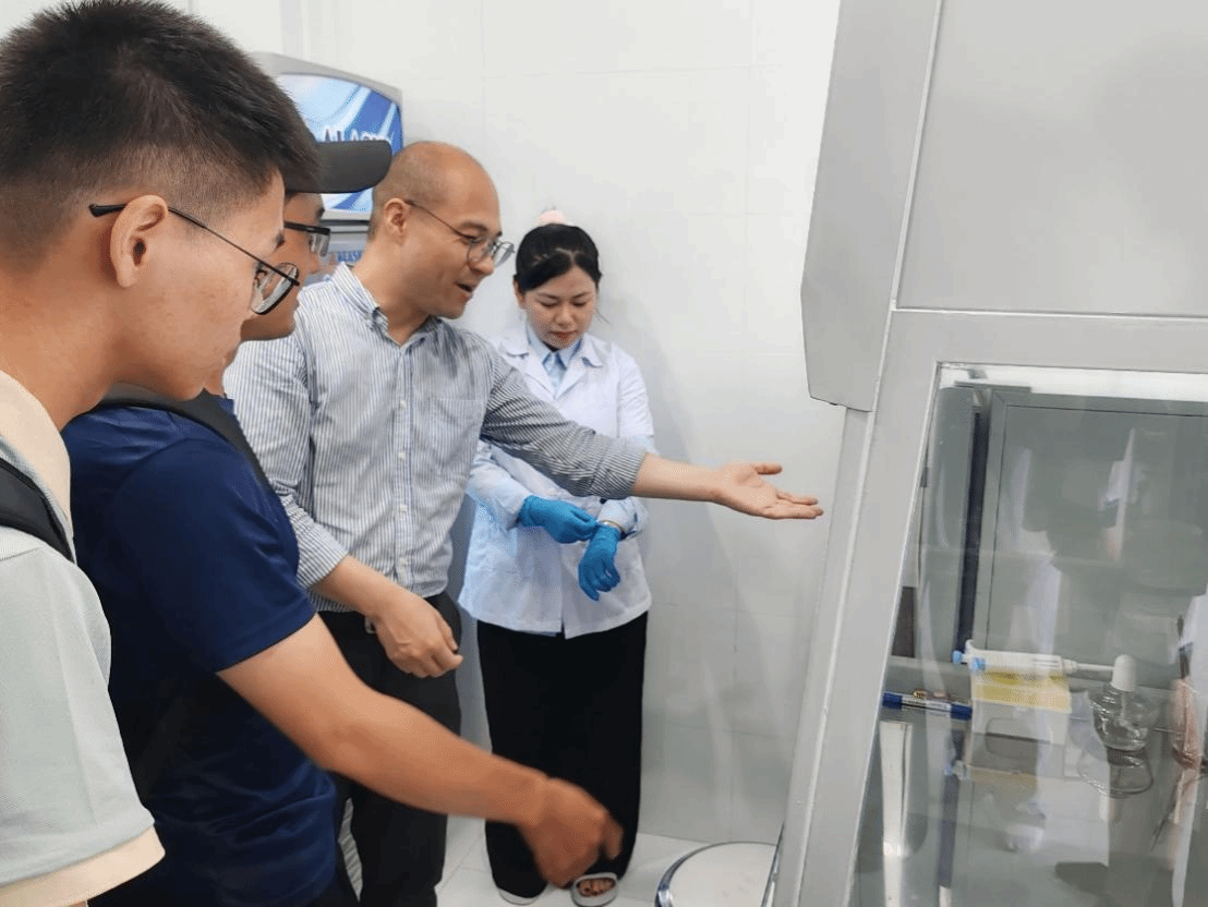 随后,团队深入潘郎-塔占市越南海大集团香螺种苗基地。技术人员展示了从受精卵到商品的完整培育链,重点讲解了通过优化沙质底床环境以适应香螺习性的创新实践。技术服务站内配备的高效PCR检测仪引起了师生的兴趣。