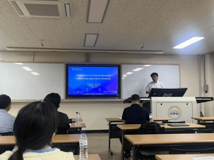 最后,访学团在教室举行了学术交流会。双方师生就各自的研究方向及水产养殖技术进行了深入的介绍和讨论,特别强调了生态保护在研究中的重要性,拓宽了学生的视野,深化了其专业认知。会上,高坚教授详细介绍了华中农业大学的基本情况,并从足球比分168