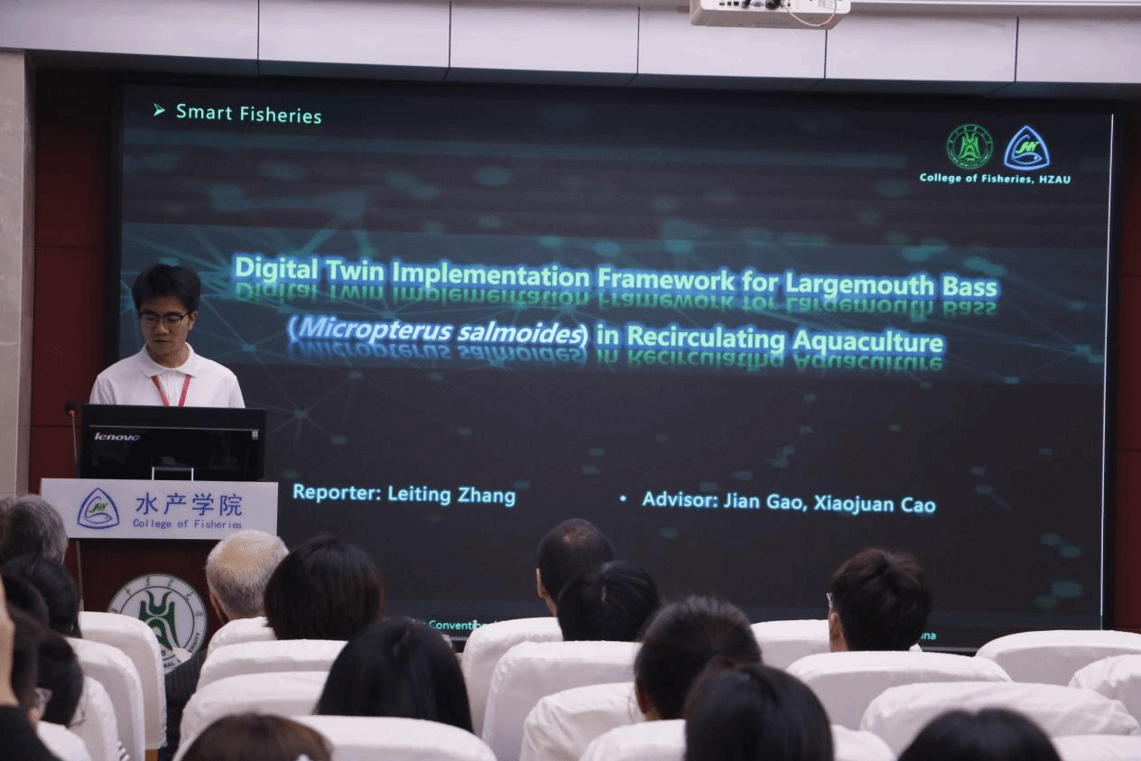随后,华中农业大学另一位博士生张雷霆作了题为“大口黑鲈循环水养殖系统的数字孪生实施框架”的报告。针对传统水产养殖面临的资源与环境压力,该研究构建了一套六层数字孪生系统:从物理层到决策层,通过水下摄像头、声学传感器等设备实现鱼类摄食行为量化分析,并利用Unity引擎建立三维动态模型。实验显示,该框架能有效整合水温、pH值等环境参数与个体行为数据,显著提升养殖密度与投喂精准度。他强调,数字孪生技术可降低循环水系统30%的运维成本,为智慧渔业发展提供了可复用的技术范式。