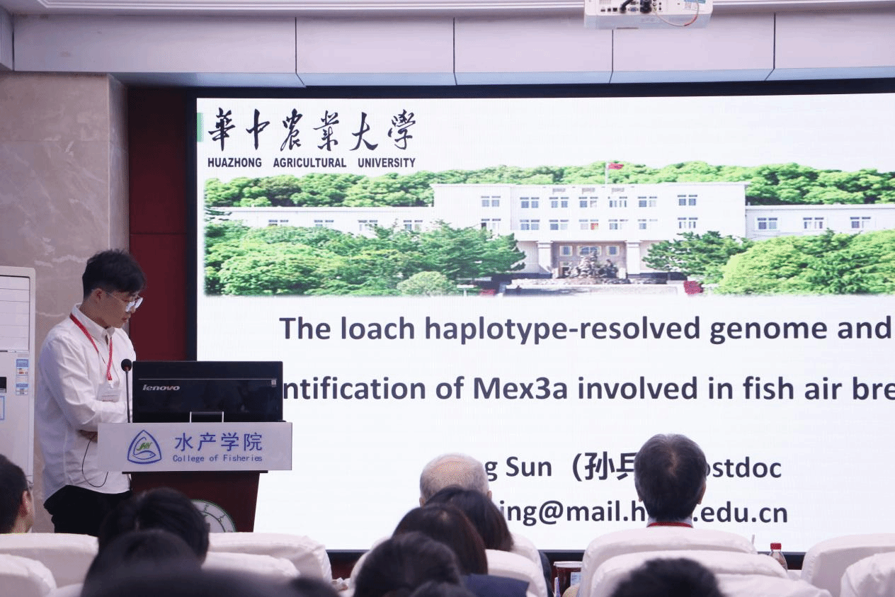华中农业大学博后孙兵作了题为“泥鳅单倍型基因组解析与鱼类气呼吸基因mex3a的鉴定”的报告。该研究首次解析了泥鳅单倍型基因组,并发现mex3a基因在鱼类气呼吸特性中起关键作用。研究建立了首个泥鳅空气暴露模型,为水产养殖抗逆品种培育提供了重要分子靶点,对发展集约化养殖具有重要意义。