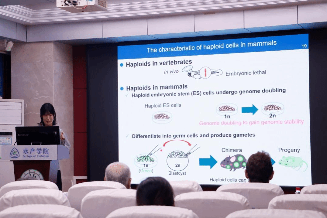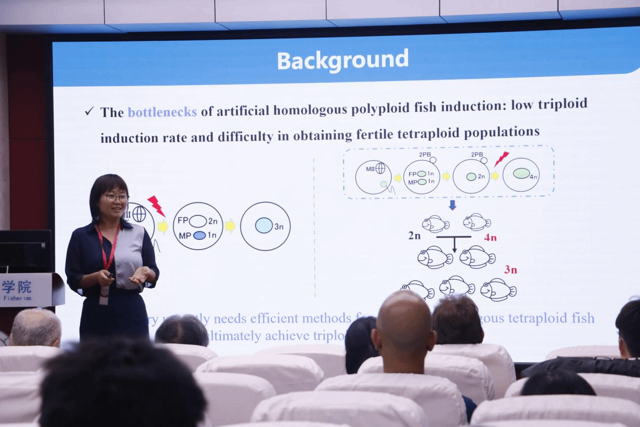最后,华中农业大学曹小娟教授作了题为“有丝分裂缺陷导致鱼类不减数精子发生”的报告。报告揭示了细胞周期调控关键基因cdk1/2和分离酶基因espl1在鱼类不减数精子发生中的重要作用。通过基因敲除实验,她所带领的团队发现Cdk1和Espl1功能缺陷会导致精母细胞有丝分裂异常,进而产生二倍体不减数精子。这类不减数精子与正常卵子结合后可形成三倍体。通过架设‘三倍体桥’成功获得了人工四倍体。人工四倍体与野生型二倍体交配后,产生了全三倍体群体,孵化率达80%以上。该成果为水产养殖三倍体育种提供了新的技术路径,可解决传统温度休克或静水压诱导法存在的效率低下等问题。