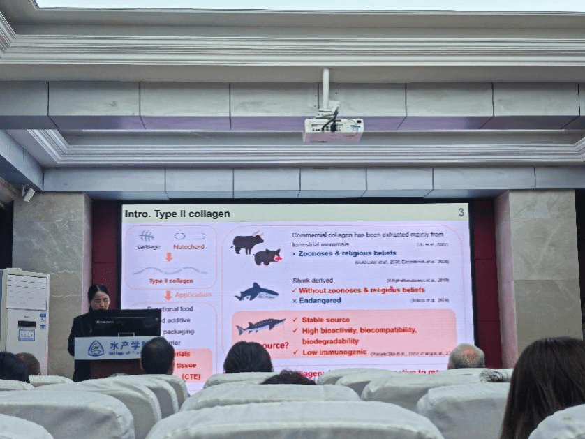 华中农业大学张曦副教授作了“鱼类Ⅱ型胶原蛋白在ATDC5细胞和人类干细胞培养中展示出软骨形成潜能”的报告。张曦博士运用 “翻转接触法” 成功使鱼源 Ⅱ 型胶原在体外自组装成纤维层,实现可重复的纤维表面构建,纤维平均直径与天然相近。通过定量逆转录聚合酶链反应检测发现,鲟鱼 Ⅱ 型胶原纤维促使 ATDC5 细胞中早期、中期软骨标记基因以及肥大软骨细胞相关基因表达上调,表明细胞积极向软骨诱导方向发展。为生物材料在水产及医学相关领域的应用研究提供了新视角和理论基础。