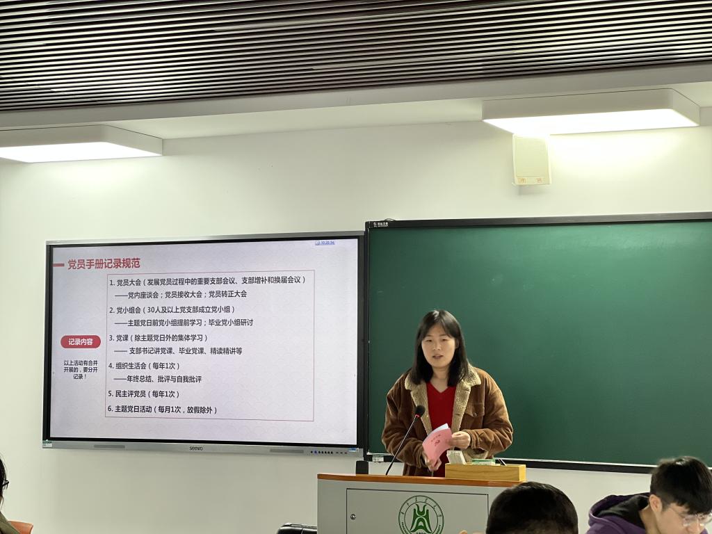 大学生党总支委员庄子梦和蔡先锋两位同志做了业务工作培训。蔡先锋讲解党支部工作手册记录规范,他逐一列出了党支部手册记录的主要内容,并详细讲述了党支部手册的记录规范。他强调党支部工作手册是党支部开展工作的重要依据,也是评价和检查的重要材料,必须具备严格规范性,记录必须保证真实性,讲求完整性和层次性,注意详实度。庄子梦讲解党员手册的记录规范,她对党员需要参加和记录的活动进行一一介绍。