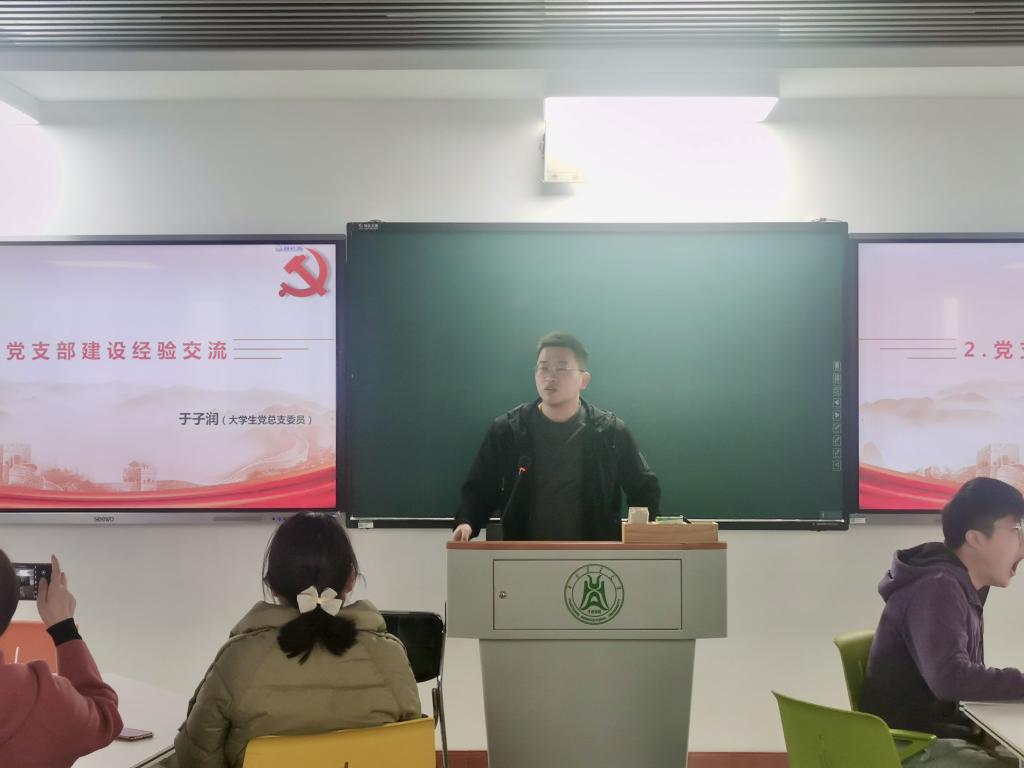 大学生党总支委员、研究生“双水双绿”党支部原书记于子润同志分享交流研究生党支部建设经验。他从自身担任两年党支部书记期间所抓的几件具体事展开,指出支部书记首先“打铁须自身硬”,其次是抓纪律,抓队伍建设,并分享了他在期间的成长和心得体会,勉励同志们要珍惜担任“学生干部”提升自己和引领他人的机会。他认为做好支部建设有三点,一是支部书记一定要努力当好支委的带头人和主心骨,在其位谋其职,带好队伍的同时提升自我修养,“想做不做,机会错过”;二是支部委员首先要坚定政治方向,团结协作,拿出魄力,敢管、敢干,要有遇到困难挫折迎难而上的心理准备和毅力;三是要将党支部的学科特色、优势亮点工作融入主题党日活动,创新党支部活动形式,以喜闻乐见的方式让理论学习入心入行。