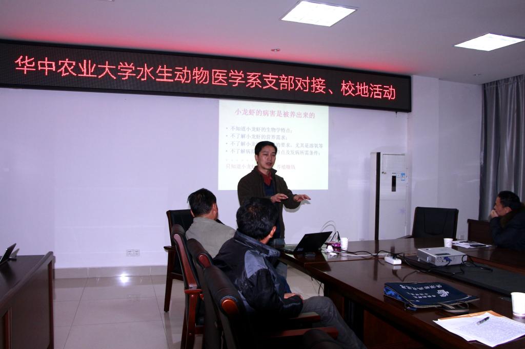 水生动物医学系教工党支部党员顾泽茂同志给大同湖管理区基层技术人员和渔民作了《小龙虾健康养殖与病害防控》的培训报告。