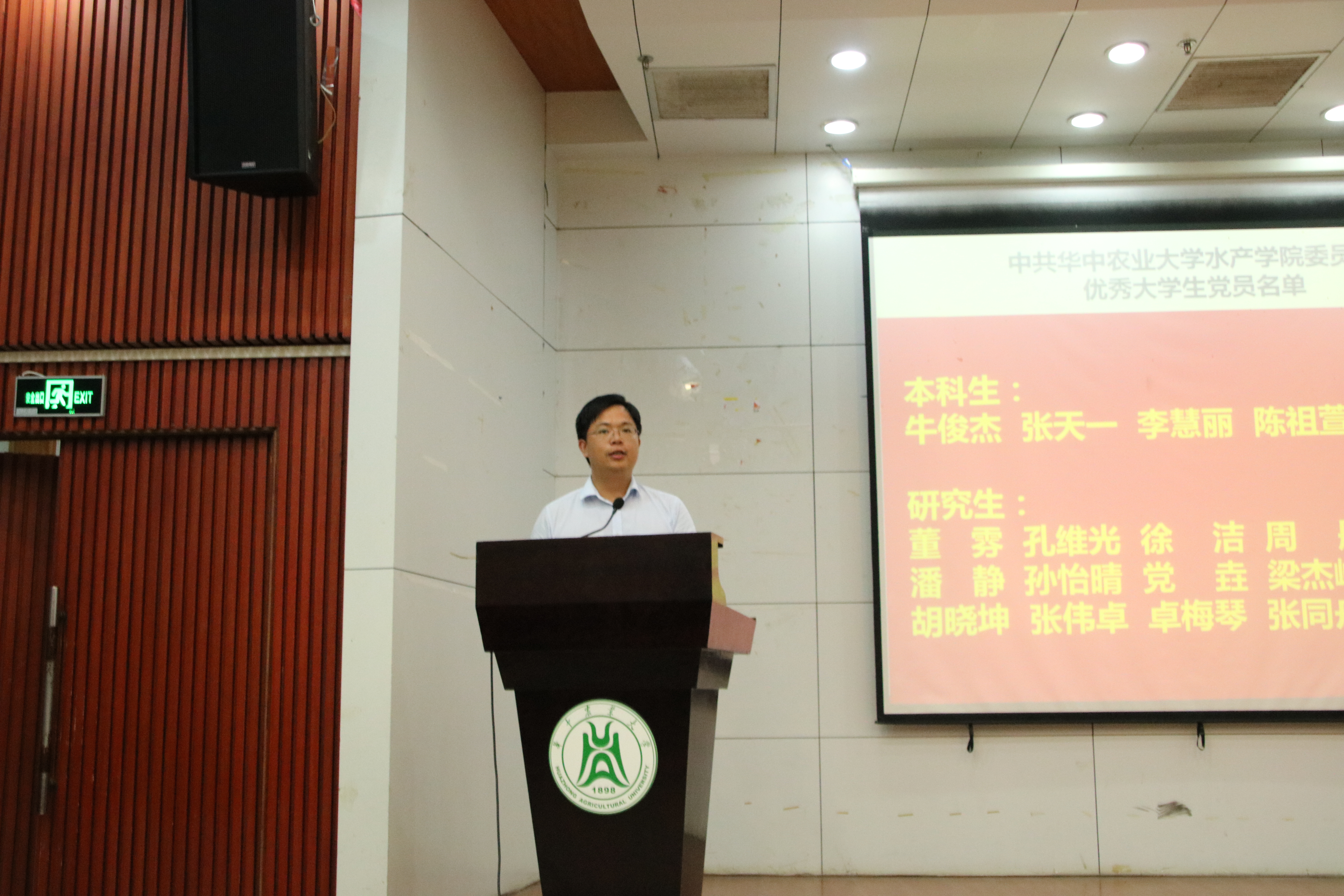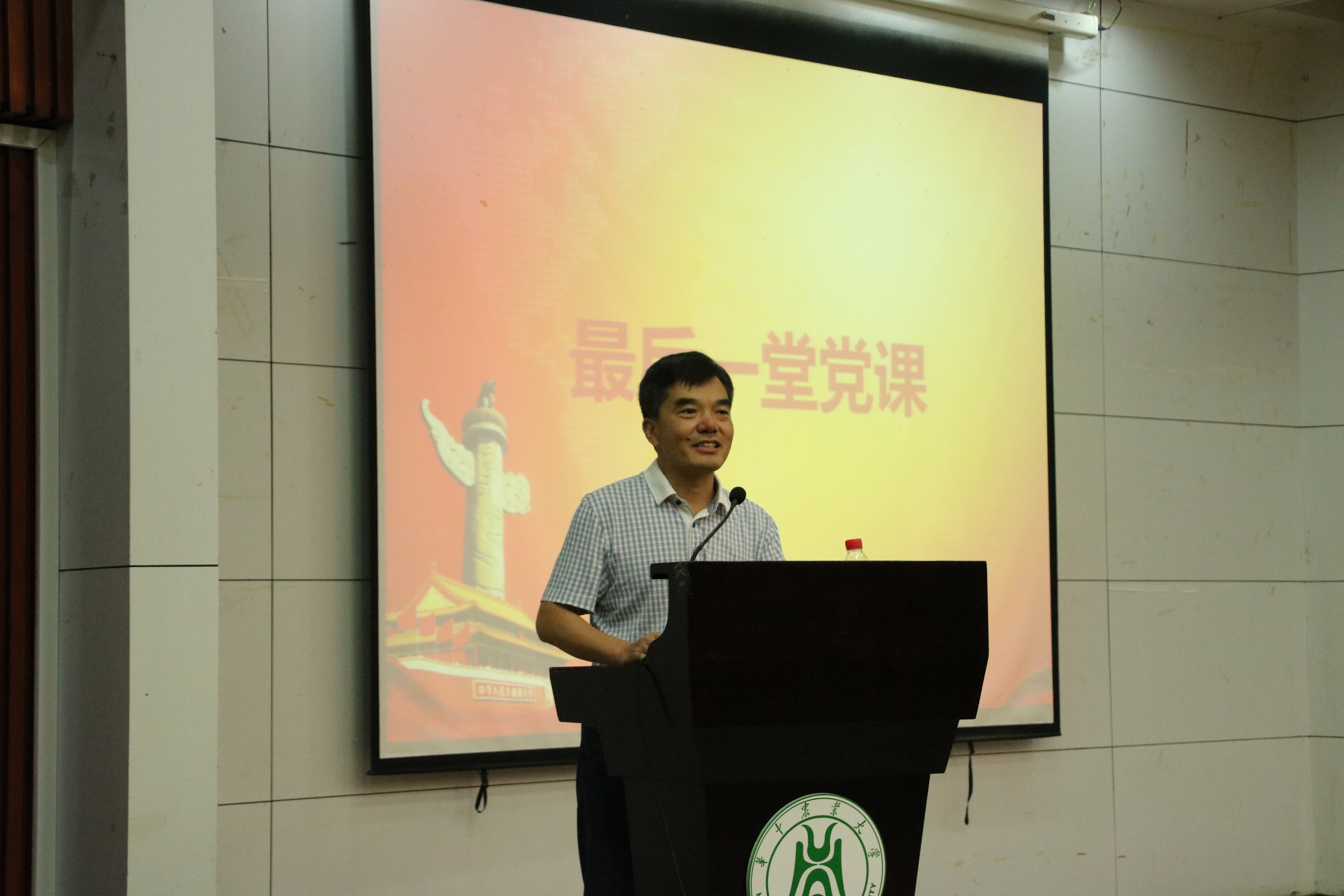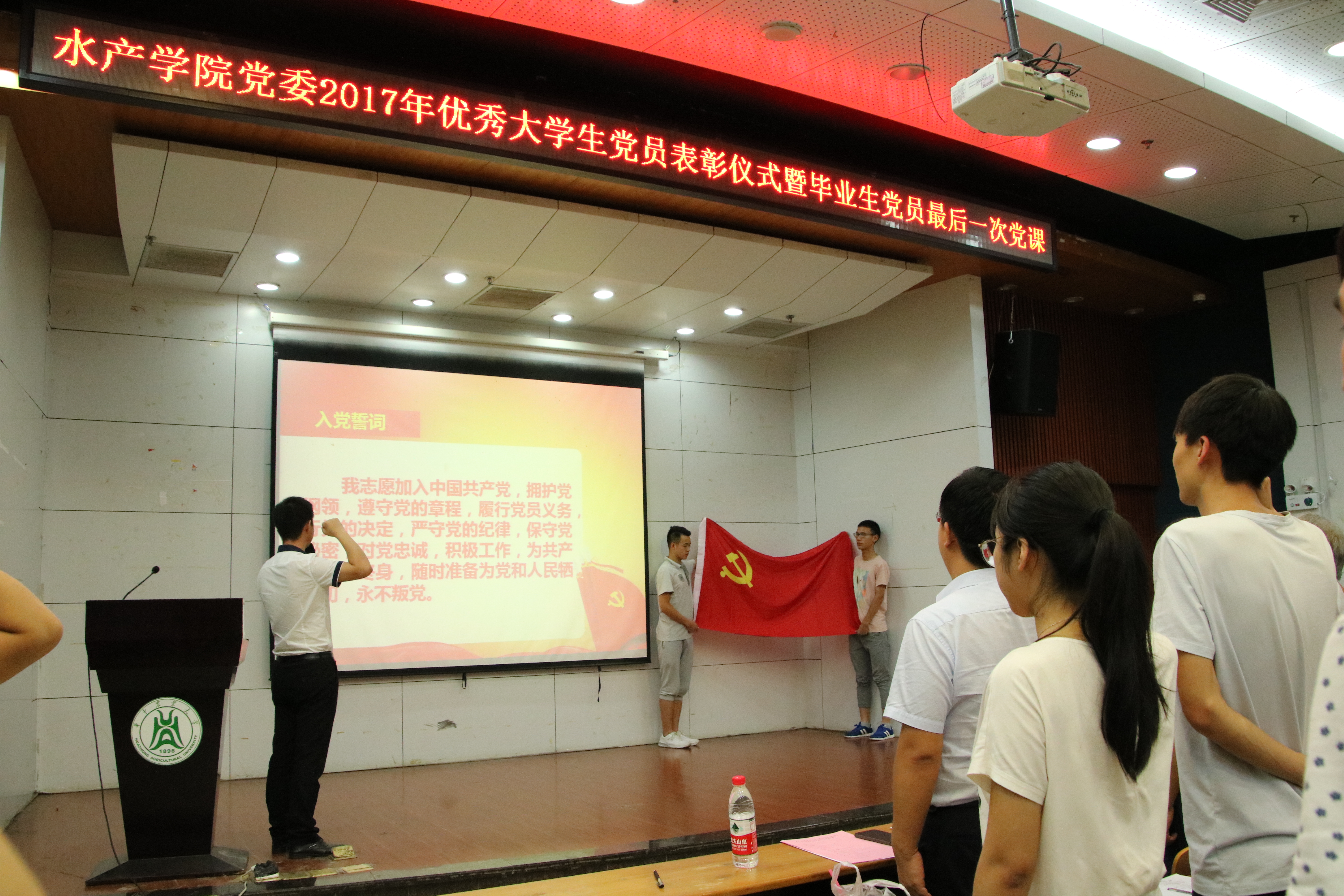 党委书记张韶东为全体党员讲授了党课。他围绕牢记第一政治身份,做不忘初心的的人;努力践行党员职责,做有事业有作为的上善水产人;自觉遵守党纪党规,做两袖清风、一身正气、清正廉洁的人等三个方面展开讲述。他向大家提出要求:“作为一名真正的共产党员,要牢记一个党员的身份,勿忘初心,为党的事业努力奋斗;要牢记我们党全心全意为人民服务的宗旨,不辱使命。”他表示,临近毕业,大家可能会留恋、不舍,但是还是要勇敢的走出校门,去面对去经历社会风雨的洗礼,努力做一个对社会对国家有贡献的人。