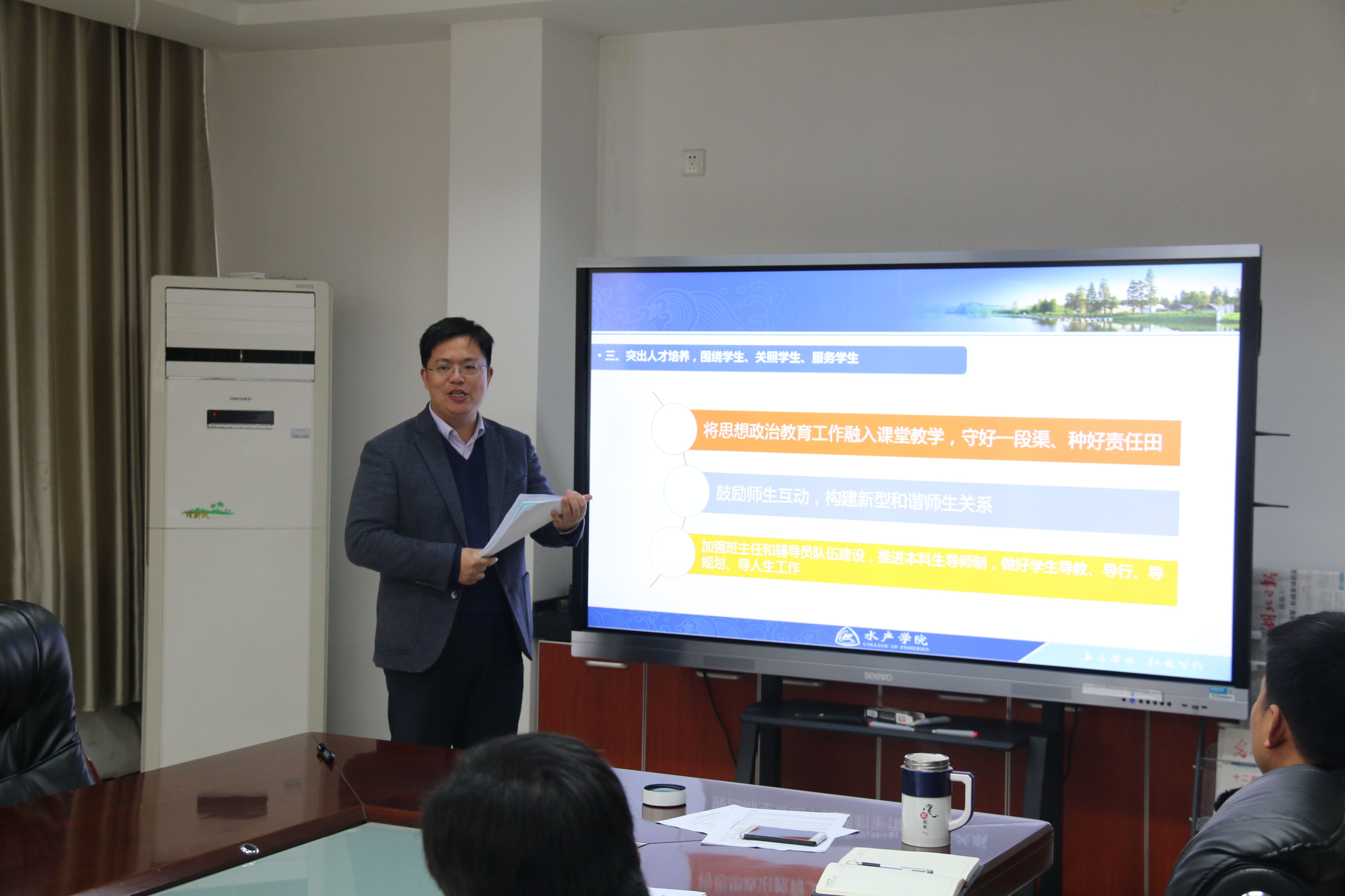 精神,发扬渔文化,打造从游文化品牌;六是要加强和改进大学生思想政治教育,要加强理想信念教育的实效性,社会主义核心价值观教育的针对性,做好选优,助困工作,帮助学生全面发展。