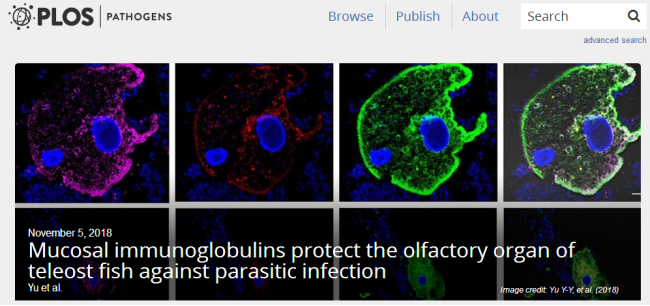 鱼类免疫与病理学团队徐镇教授课题组在病原学领域杂志PLOS PATHOGENS 发表了题为“Mucosal immunoglobulins protect the olfactory organ of teleost fish against parasitic infection” 的研究论文。