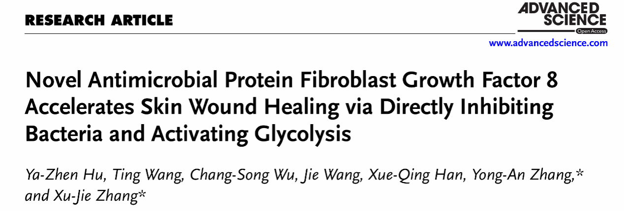 近日,我校足球比分168 鱼类免疫与病害防控团队在Advanced Science期刊上发表题为“Novel Antimicrobial Protein Fibroblast Growth Factor 8 Accelerates Skin Wound Healing via Directly Inhibiting Bacteria and Activating Glycolysis”的研究论文。该研究首次揭示成纤维细胞生长因子8(FGF8)兼具抗菌与代谢调控双重功能,可通过直接杀灭细菌并激活糖酵解加速皮肤伤口愈合,为开发新型抗感染促修复药物提供了重要理论基础和候选分子。