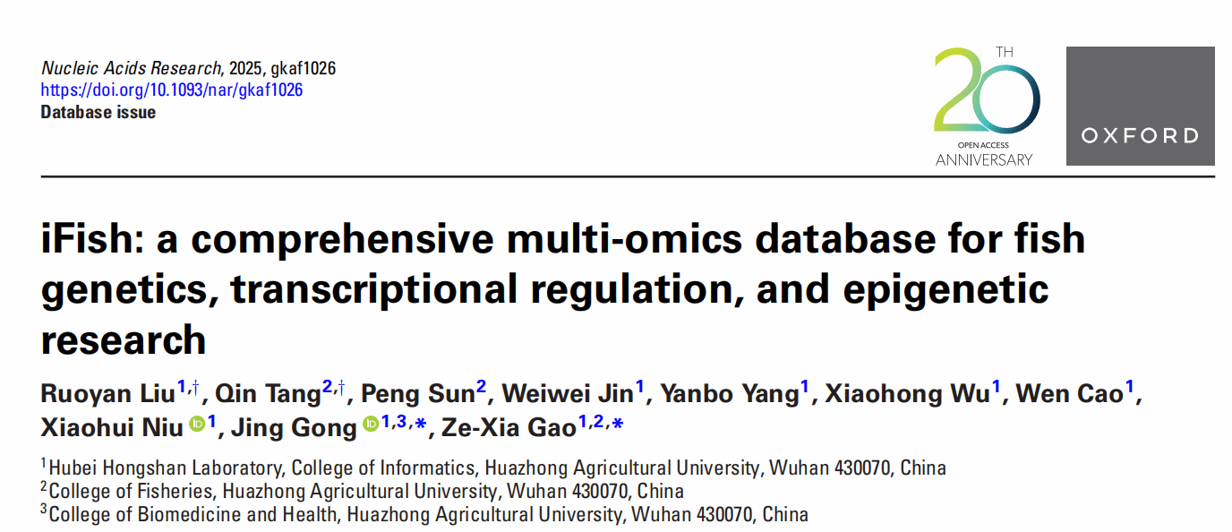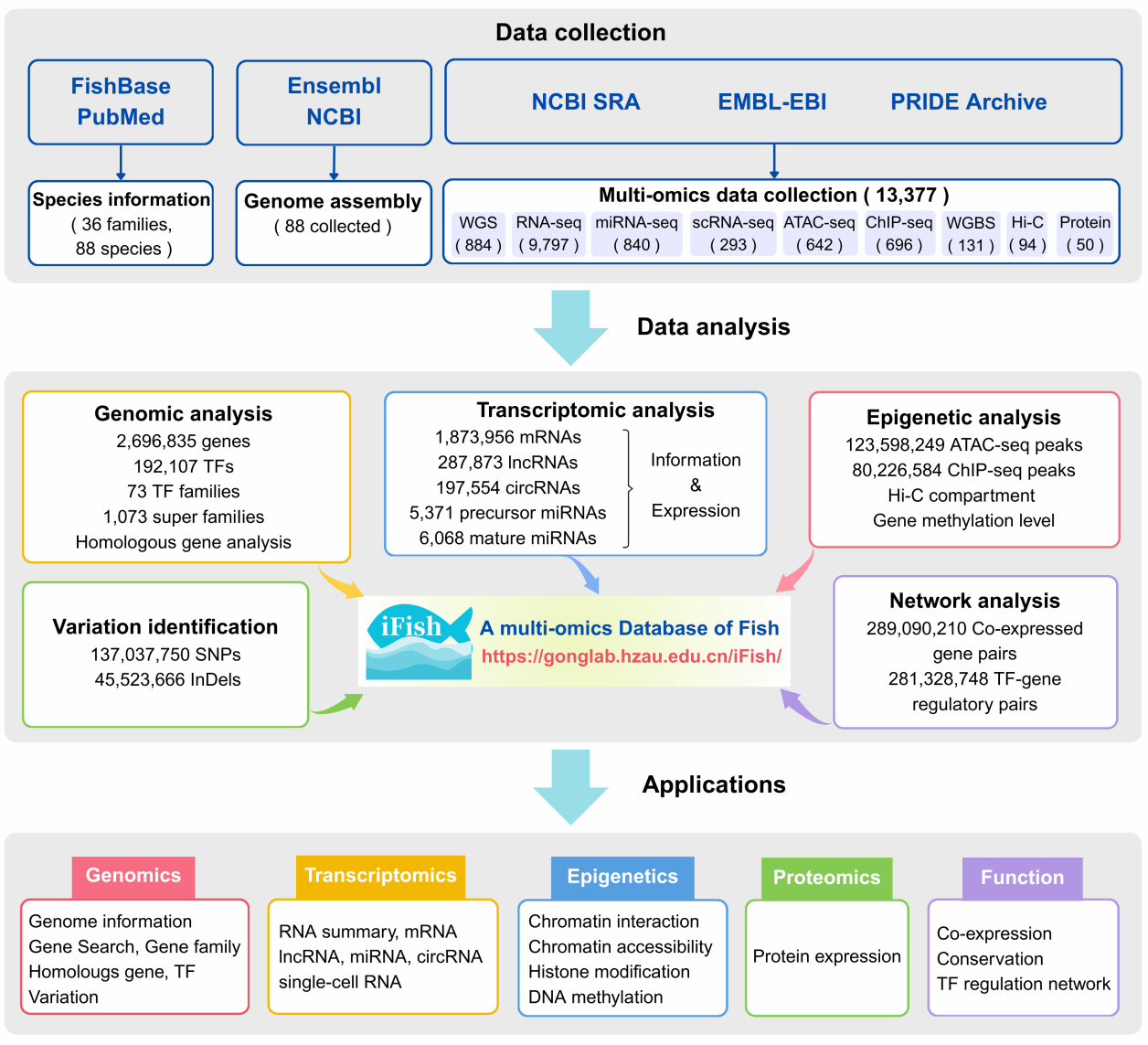 龚静教授团队在Nucleic Acids Research期刊上发表题为“iFish: a comprehensive multi-omics database for fish genetics, transcriptional regulation, and epigenetic research”的研究论文。该团队开发的“iFish”综合性鱼类多组学数据库(//gonglab.zqbf168.com/iFish/),不仅整合了基因组图谱、基因表达谱、表观遗传修饰及蛋白质组数据,还实现了遗传变异、转录因子(TFs)及非编码RNA(ncRNAs)的系统鉴定。它是迄今为止系统整合、分析和存储鱼类多组学数据的最全面平台,将成为鱼类遗传学、转录调控和表观遗传学研究的重要资源。